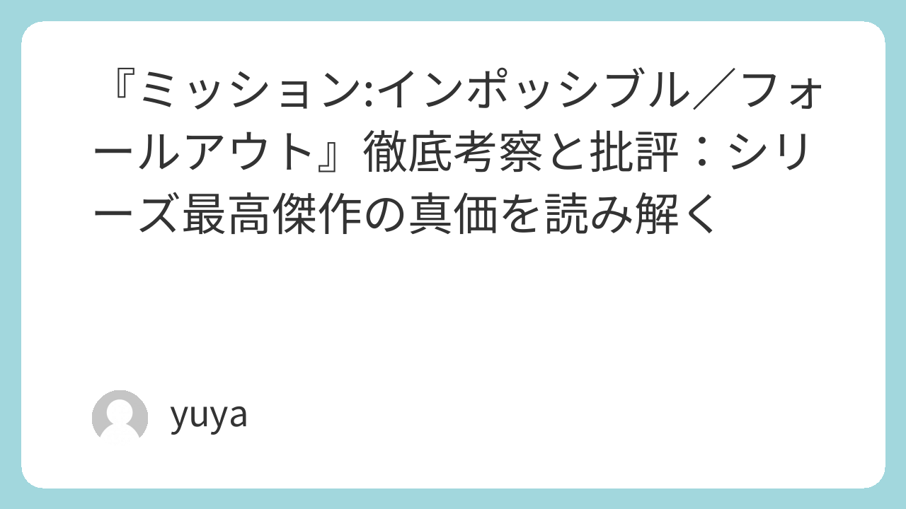 『フォールアウト』は、単なるアクション映画ではなく、シリーズ全体を総括する重みと、主人公の心理描写、現代的なテーマ(核・組織の信頼・選択の倫理)を内包した作品です。トム・クルーズの情熱と映画制作へのこだわりが画面の隅々から伝わってくる、まさに“ミッション:インポッシブル”の集大成。