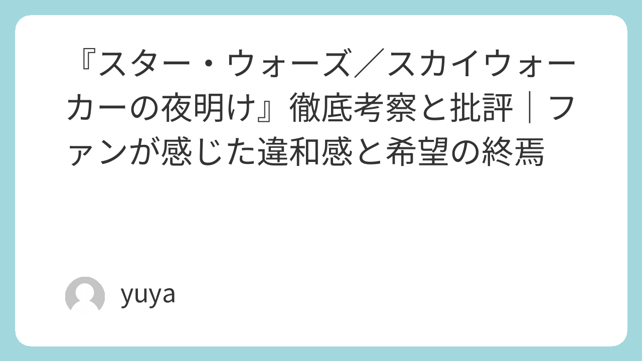 『スカイウォーカーの夜明け』は、長大なスペースオペラの完結編として、視覚的にも感情的にも多くの見どころを提供しました。一方で、制作背景の混乱、プロットの矛盾、キャラクターの扱いの軽さなどから、“ファンの期待に応えること”と“物語の整合性”との間で揺れ動いた作品とも言えるでしょう。
