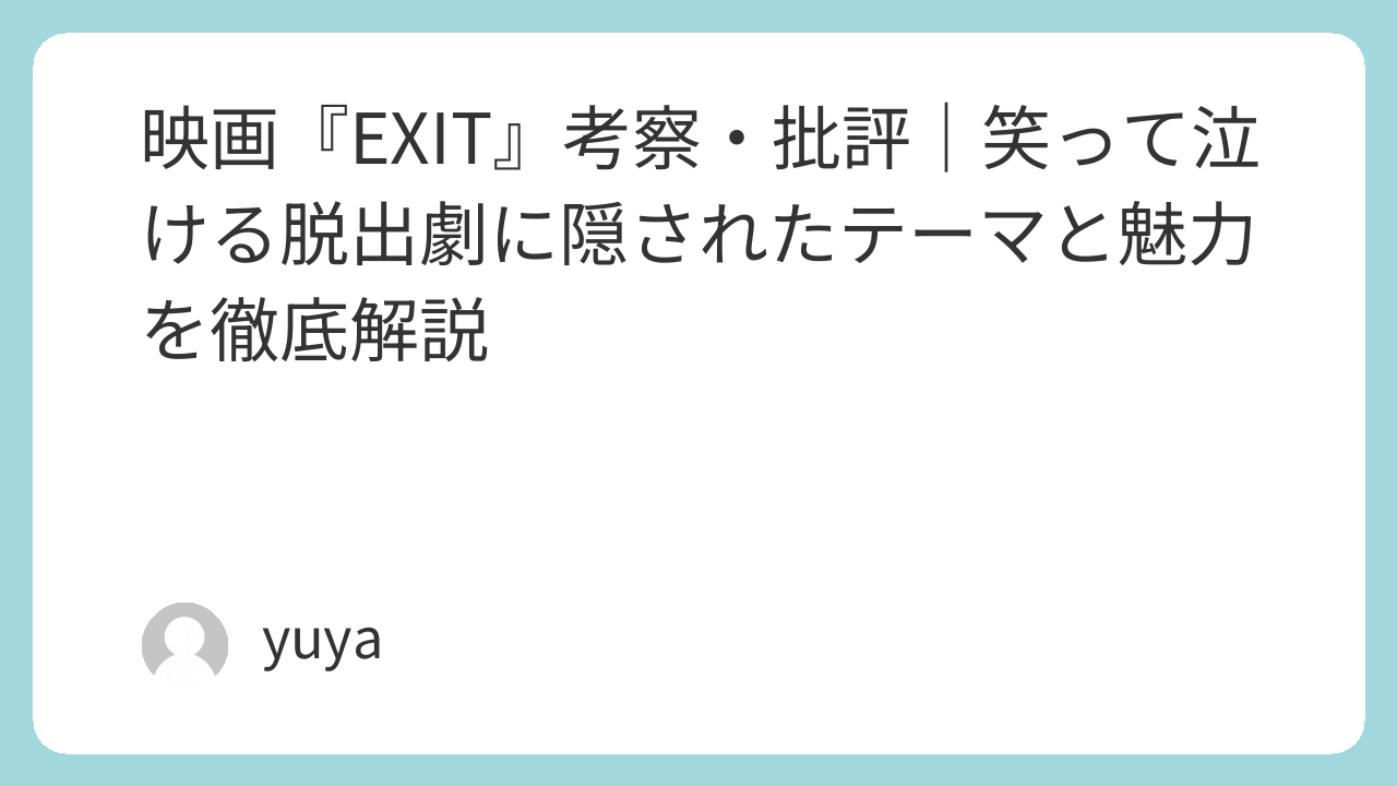 『EXIT』は、ジャンル映画の枠組みを活かしつつ、「人生の行き詰まりからの脱出」という普遍的テーマをエンタメとして描ききった点が高く評価されています。笑いとスリルの絶妙なバランス、感情移入しやすいキャラクター、家族の絆という心の拠り所──それらが観客の共感を呼び、単なる“脱出劇”ではない深みを持った作品として支持されているのです。