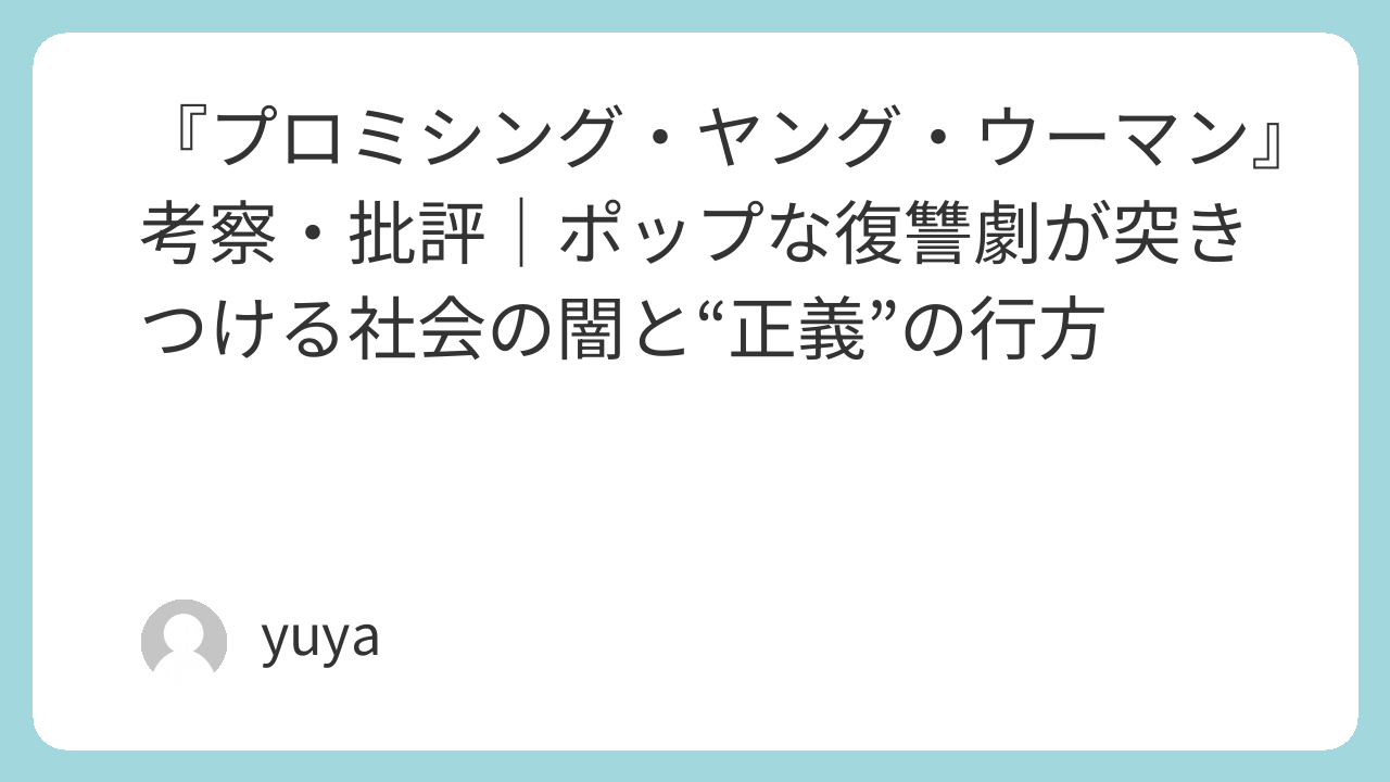 『プロミシング・ヤング・ウーマン』は、ジャンル映画のフォーマットを借りながら、非常に社会的で現代的なテーマを鋭く描いた作品です。ポップな見た目に反して、観客の心に爪痕を残す“問題作”であり、“問いかけの映画”とも言えます。