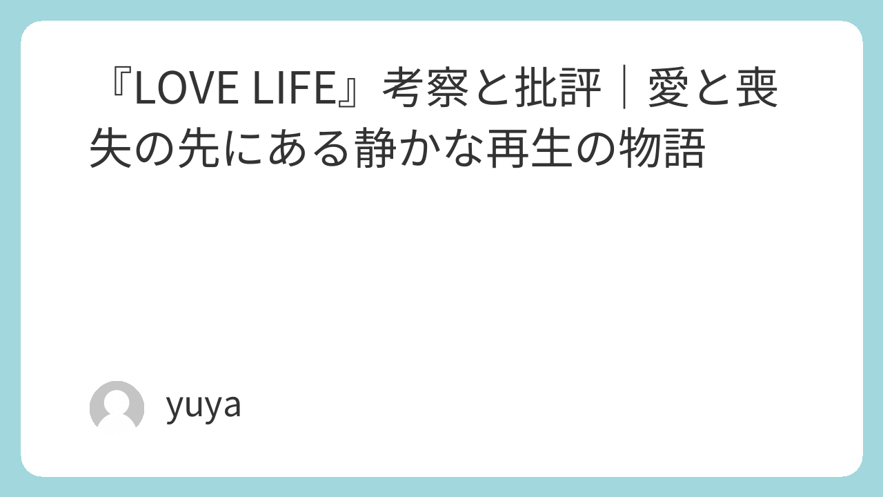 『LOVE LIFE』は、静かな語り口で、愛と喪失、人生の再生という普遍的なテーマを深く描いた作品です。明快な答えは用意されていないものの、その“余白”こそが本作の本質であり、観る者に思考と感情を強く促す力を持っています。日常の中に潜む「生きることの意味」を見つめ直したいとき、ぜひ観てほしい一作です。