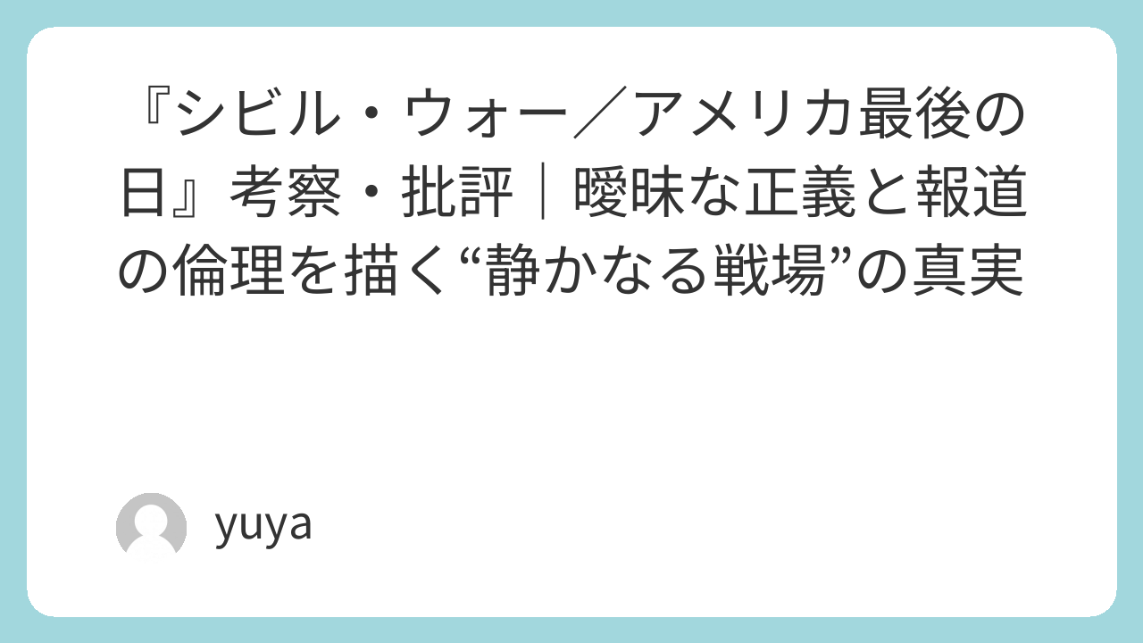 『シビル・ウォー/アメリカ最後の日』は、内戦という極限状況を通じて「報道の本質」や「真実を伝えることの倫理」を深く問い直す社会派スリラーであり、現代を生きる私たち一人ひとりの「見る目」を試される作品です。映像表現の巧みさだけでなく、語られない情報の“空白”が観客の想像力と考察を促す構成は、非常に挑戦的かつ知的な体験を提供します。