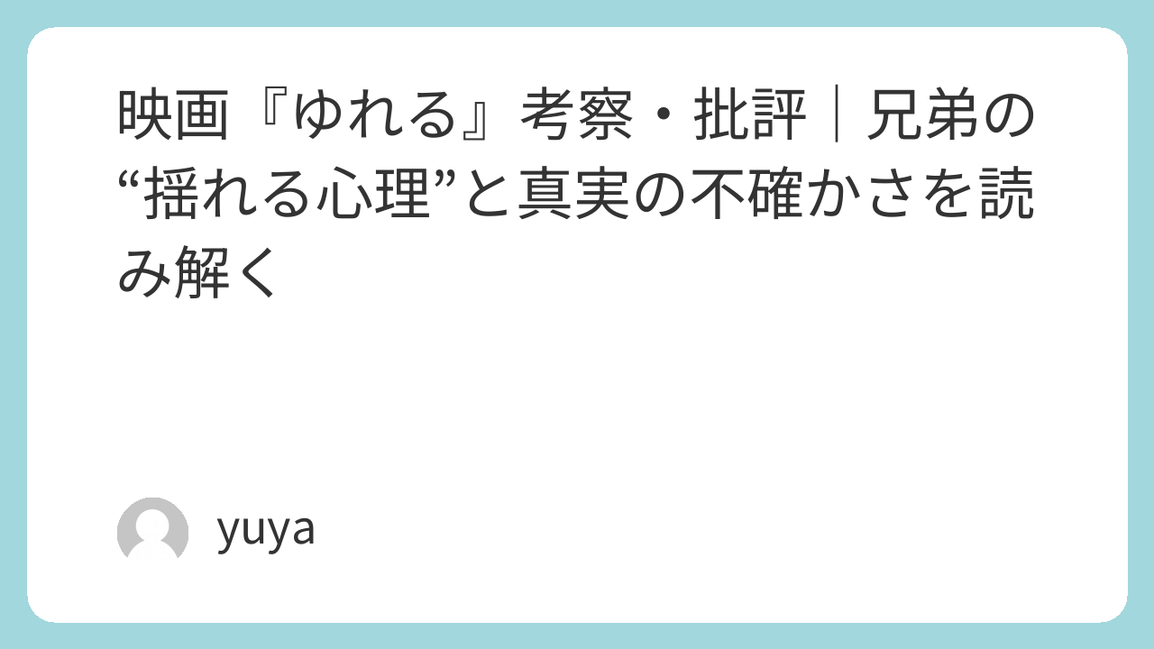 映画『ゆれる』は、兄弟という極めて身近な人間関係を通して、「真実とは何か」「人間は他者をどこまで理解できるのか」といった根源的な問いを観客に投げかけてきます。演出、演技、構成のすべてが緻密に絡み合い、一度観ただけでは理解しきれない深みを持った作品です。まさに“揺れる”人間の心を、そのまま映し出した傑作といえるでしょう。