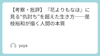 【考察・批評】『花よりもなほ』に見る“仇討ち”を超えた生き方──是枝裕和が描く人間の本質 是枝裕和監督による時代劇『花よりもなほ』(2006年公開)は、いわゆる“仇討ち”という題材を扱いながら、その本質を巧みにすり替え、温かくも皮肉な視点で“生きること”そのものを問いかける異色作です。本記事では、本作の物語構造、登場人物、時代設... 2025.09.29 Uncategorized