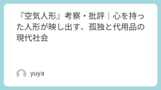 『空気人形』考察・批評|心を持った人形が映し出す、孤独と代用品の現代社会 是枝裕和監督による異色作『空気人形』(2009年)は、観る者に深い問いを投げかける哲学的な作品です。「空気人形」という一見ファンタジーめいた存在を通じて、現代人が抱える〈孤独〉や〈代替性〉、そして〈心〉とは何かを繊細に描いています。本記事で... 2025.09.29 Uncategorized
