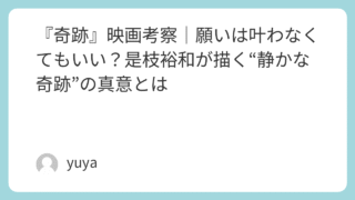 『奇跡』映画考察|願いは叶わなくてもいい?是枝裕和が描く“静かな奇跡”の真意とは 是枝裕和監督による2011年の映画『奇跡』は、兄弟の再会を軸に「奇跡」を信じる心と、その裏にある現実との折り合いを描いた作品です。タイトルにある「奇跡」という言葉から超常的な現象を想像するかもしれませんが、本作で描かれるのは、どこにでもある... 2025.09.29 Uncategorized