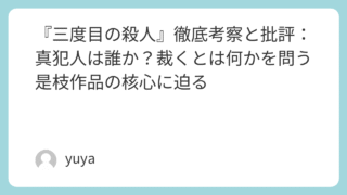 『三度目の殺人』徹底考察と批評:真犯人は誰か?裁くとは何かを問う是枝作品の核心に迫る 是枝裕和監督が手がけた法廷サスペンス映画『三度目の殺人』は、その重厚なテーマ性と繊細な演出によって、多くの観客に強い印象を残しました。本作は単なる殺人事件の解明にとどまらず、「人を裁くとはどういうことか」「真実とは何か」「正義はどこにあるの... 2025.09.29 Uncategorized