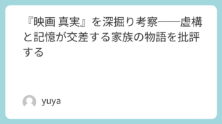 『映画 真実』を深掘り考察──虚構と記憶が交差する家族の物語を批評する 映画には単なる娯楽を超えた深淵なテーマが存在します。中でも「真実」とは何かを問いかける作品は、多層的な構造や心理的な駆け引きを通じて、観客の思考を刺激します。本記事では、虚構と現実、記憶と改変、家族と愛情の中に潜む“真実”を、批評的視点から... 2025.09.29 Uncategorized