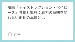 映画『ディストラクション・ベイビーズ』考察と批評:暴力の意味を問わない衝動の本質とは 『ディストラクション・ベイビーズ』は、2016年に真利子哲也監督が手がけた衝撃作です。主演・柳楽優弥の圧倒的な存在感と、説明のつかない暴力性が賛否を呼びました。物語は、愛媛県松山市を舞台に、突如として人々を殴り始める青年・泰良(たいら)を軸... 2025.09.29 Uncategorized