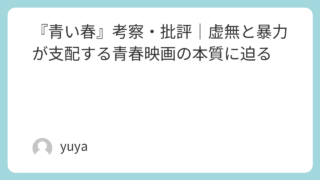『青い春』考察・批評|虚無と暴力が支配する青春映画の本質に迫る 青春映画というと、多くの人は希望や成長、友情といったポジティブな要素を想像するかもしれません。しかし、豊田利晃監督の『青い春』(2002年)は、その常識を覆す作品です。本作は、暴力と無気力、そして死と隣り合わせの日常を淡々と描きながら、観る... 2025.09.29 Uncategorized