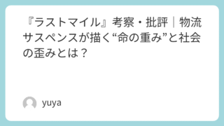 『ラストマイル』考察・批評|物流サスペンスが描く“命の重み”と社会の歪みとは? 現代日本において「ラストマイル」は、単なる物流用語を超えた意味を持ち始めている。2024年に公開された映画『ラストマイル』は、そのタイトル通り、“最後のひと届け”に込められた命と社会構造の重みを描いた問題作である。本記事では、本作の構造や演... 2025.09.30 Uncategorized