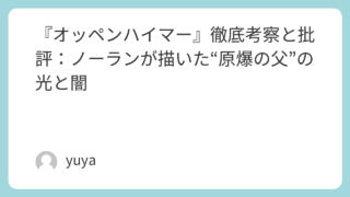 『オッペンハイマー』徹底考察と批評:ノーランが描いた“原爆の父”の光と闇 クリストファー・ノーラン監督による映画『オッペンハイマー』は、原爆を開発した男として知られるロバート・オッペンハイマーの内面と葛藤、そして歴史的な重責を描いた重厚な伝記映画です。本作はアメリカでの公開直後から高い評価を受け、日本でもIMAX... 2025.09.30 Uncategorized