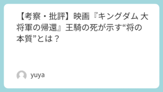 【考察・批評】映画『キングダム 大将軍の帰還』王騎の死が示す“将の本質”とは? 2025年夏に公開された映画『キングダム 大将軍の帰還』は、シリーズ第4作として大きな期待を背負いながら登場しました。原作ファンはもちろん、映画シリーズからキングダムに触れた観客にも深い印象を与える作品となっています。この記事では「物語の構... 2025.09.30 Uncategorized