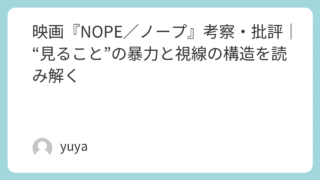 映画『NOPE/ノープ』考察・批評|“見ること”の暴力と視線の構造を読み解く ジョーダン・ピール監督による映画『NOPE/ノープ』(2022)は、単なるSFホラーやスリラーの枠に収まらない、非常に多層的なメッセージを内包した作品です。「見られること」「見ること」に対する執着、暴力、そしてそれを撮影し収益化するエンタメ... 2025.09.25 Uncategorized