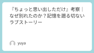 『ちょっと思い出しただけ』考察|なぜ別れたのか?記憶を遡る切ないラブストーリー 2022年公開の映画『ちょっと思い出しただけ』(監督:松居大悟)は、恋人同士だった二人の「別れの記憶」を巻き戻しながらたどる、静かで切ないラブストーリーです。主演の池松壮亮と伊藤沙莉が紡ぐ自然体の演技と、ある日常のひとコマのようなリアリズム... 2025.09.25 Uncategorized