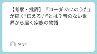 【考察・批評】『コーダ あいのうた』が描く“伝える力”とは?音のない世界から届く家族の物語 2021年に公開された映画『コーダ あいのうた』は、ろう者の家族の中で唯一耳が聴こえる少女ルビーが、音楽の夢と家族との絆の狭間で揺れる姿を描いた感動作です。原作はフランス映画『エール!』であり、本作はそのハリウッドリメイク作品としても注目さ... 2025.09.26 Uncategorized