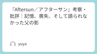 『Aftersun/アフターサン』考察・批評|記憶、喪失、そして語られなかった父の影 『Aftersun/アフターサン』(2022)は、スコットランド出身のシャーロット・ウェルズ監督が手掛けた長編デビュー作でありながら、極めて繊細かつ詩的な映像体験を提供する傑作として高く評価されています。一見すると父娘の穏やかなバカンスの記... 2025.09.26 Uncategorized