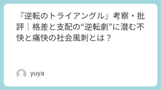『逆転のトライアングル』考察・批評|格差と支配の“逆転劇”に潜む不快と痛快の社会風刺とは? 2022年、カンヌ国際映画祭でパルム・ドールを受賞し、一躍注目を集めた映画『逆転のトライアングル(Triangle of Sadness)』。本作は、ファッション業界の表と裏、豪華客船での階級崩壊、そして無人島での逆転劇という三部構成で展開... 2025.09.26 Uncategorized