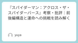 『スパイダーマン:アクロス・ザ・スパイダーバース』考察・批評|前後編構造と運命への挑戦を読み解く マーベル映画の中でも異彩を放つアニメーションシリーズ『スパイダーバース』の続編『スパイダーマン:アクロス・ザ・スパイダーバース』は、映像美、ストーリーテリング、そしてキャラクターの深みを兼ね備えた秀作として多くの映画ファンから絶賛されていま... 2025.09.26 Uncategorized