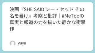 映画『SHE SAID シー・セッド その名を暴け』考察と批評|#MeTooの真実と報道の力を描いた静かな衝撃作 映画「SHE SAID シー・セッド その名を暴け」は、実際の事件を基にしたジャーナリズム映画であり、ハーヴェイ・ワインスタインの性的暴行問題を中心に報じた、ジャーナリストたちの戦いとその背後にある社会的なテーマを描いています。本作は、単な... 2025.09.26 Uncategorized