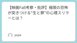 【映画Fall考察・批評】極限の恐怖が突きつける“生と罪”の心理スリラーとは? 高所という極限状況を舞台に、観客の手汗を誘うサバイバル・スリラー『Fall/フォール』。わずか1か所で展開されるシンプルな構造ながら、極限状態で揺れ動く心理、意外な展開、そして息を呑む映像美によって観る者を釘付けにします。本記事では、映画『... 2025.09.28 Uncategorized
