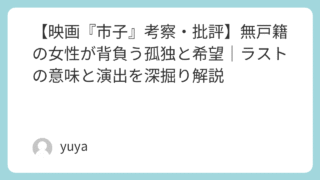 【映画『市子』考察・批評】無戸籍の女性が背負う孤独と希望|ラストの意味と演出を深掘り解説 現代社会の見過ごされがちな問題を鋭く掘り下げた映画『市子』は、単なる人間ドラマにとどまらず、無戸籍や家族制度といった社会制度の矛盾を背景に、ひとりの女性の「存在」を深く描き出した作品です。その重層的な構造と複雑な人物像、繊細な演出が多くの観... 2025.09.28 Uncategorized