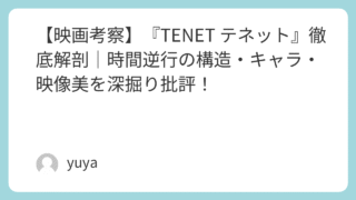 【映画考察】『TENET テネット』徹底解剖|時間逆行の構造・キャラ・映像美を深掘り批評! クリストファー・ノーラン監督の『TENET テネット』は、公開当初から「難解」「もう一度見たい」「何度見ても新たな発見がある」と話題になった作品です。その複雑な構造や時間逆行という独自のアイデア、登場人物の多層的な関係性は、まさに“考察欲”... 2025.09.24 Uncategorized