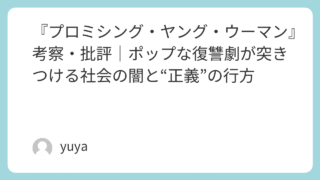 『プロミシング・ヤング・ウーマン』考察・批評|ポップな復讐劇が突きつける社会の闇と“正義”の行方 アカデミー賞脚本賞を受賞した映画『プロミシング・ヤング・ウーマン』は、単なる復讐劇ではありません。ポップな音楽と華やかなファッションの裏側に潜むのは、女性が抱える「声なき怒り」と社会の「構造的な加害性」です。本記事では、キャラクター、演出、... 2025.09.25 Uncategorized