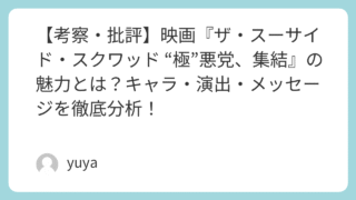 【考察・批評】映画『ザ・スーサイド・スクワッド “極”悪党、集結』の魅力とは?キャラ・演出・メッセージを徹底分析! DCコミックス原作の異色チーム映画『ザ・スーサイド・スクワッド “極”悪党、集結』は、2021年に公開され、前作の続編でありながらも、ジェームズ・ガン監督の手により独立した新作として再構築された作品です。本記事では、DCユニバースにおける本... 2025.09.25 Uncategorized