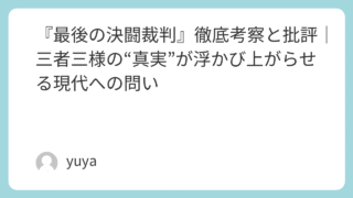 『最後の決闘裁判』徹底考察と批評|三者三様の“真実”が浮かび上がらせる現代への問い リドリー・スコット監督が手がけた歴史ドラマ『最後の決闘裁判』は、14世紀フランスの実話をもとにした重厚な人間ドラマでありながら、現代社会に鋭い問いを投げかける作品として高く評価されています。本作は、レイプという重大なテーマを中心に、登場人物... 2025.09.25 Uncategorized