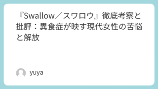 『Swallow/スワロウ』徹底考察と批評:異食症が映す現代女性の苦悩と解放 2019年に公開されたアメリカ映画『Swallow(スワロウ)』は、主人公ハンターが「異食症(ピカ症)」という症状に苦しむ様子を描いた異色の心理スリラーです。静かで美しい映像と裏腹に、観客の心を深くえぐるテーマを含んでおり、公開からしばらく... 2025.09.25 Uncategorized