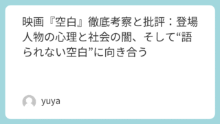 映画『空白』徹底考察と批評:登場人物の心理と社会の闇、そして“語られない空白”に向き合う 映画『空白』は、古田新太と松坂桃李の圧倒的な演技力によって、観客の心を深く揺さぶる社会派ヒューマンドラマです。スーパーでの万引きを巡る出来事を発端に、登場人物たちの内面、社会の空気、そして誰もが抱える「言葉にならない感情の空白」を浮き彫りに... 2025.09.25 Uncategorized