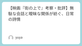 【映画『街の上で』考察・批評】無駄な会話と曖昧な関係が紡ぐ、日常の詩情 今泉力哉監督による映画『街の上で』(2021年)は、下北沢という街に暮らす青年・荒川青を中心に、彼を取り巻く複数の女性たちとの関わりを、柔らかな時間の流れのなかで描き出します。この作品が提示するのは、物語性よりもむしろ“何も起こらないこと”... 2025.09.25 Uncategorized
