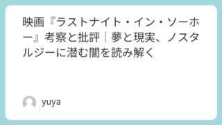 映画『ラストナイト・イン・ソーホー』考察と批評|夢と現実、ノスタルジーに潜む闇を読み解く 現代と1960年代ロンドンを舞台に、若きファッション学生エロイーズが夢を通じて“過去”とリンクするサイコスリラー『ラストナイト・イン・ソーホー』。その美しい映像と不穏な展開の裏に、数々の社会的メッセージと巧妙な構造が隠されています。本記事で... 2025.09.25 Uncategorized