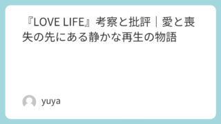 『LOVE LIFE』考察と批評|愛と喪失の先にある静かな再生の物語 現代日本映画の中でも、静かにして深く心を打つ作品として話題となった深田晃司監督の『LOVE LIFE』。本作は、BoAの同名楽曲に着想を得ながら、愛・喪失・再生をテーマに、登場人物たちの複雑な感情の揺れと、それぞれの選択を描いています。この... 2025.09.25 Uncategorized