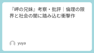 『岬の兄妹』考察・批評|倫理の限界と社会の闇に踏み込む衝撃作 2019年に公開された片山慎三監督の『岬の兄妹』は、障害を持つ兄妹の過酷な現実を通して、社会の矛盾や倫理の限界を容赦なく突きつける衝撃作です。描かれるのは「普通」から遠く隔たった生活と、選択肢なき選択。観る者に強烈な問いを残すこの作品を、複... 2025.09.23 Uncategorized