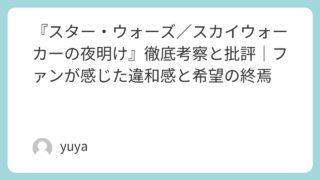 『スター・ウォーズ/スカイウォーカーの夜明け』徹底考察と批評|ファンが感じた違和感と希望の終焉 「遠い昔、遥か彼方の銀河系で──」このおなじみのフレーズから始まるスター・ウォーズサーガは、42年の歴史を経て『スター・ウォーズ/スカイウォーカーの夜明け(EP9)』で一応の完結を迎えました。しかしそのラストは、シリーズのファンや批評家の間... 2025.09.24 Uncategorized