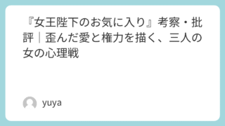 『女王陛下のお気に入り』考察・批評|歪んだ愛と権力を描く、三人の女の心理戦 『女王陛下のお気に入り』(原題:The Favourite)は、2018年に公開されたヨルゴス・ランティモス監督の歴史ドラマ映画でありながら、その実、極めて現代的なテーマを孕んだ異色作です。舞台は18世紀初頭のイングランド宮廷。病弱なアン女... 2025.09.24 Uncategorized