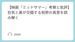 【映画『ミッドサマー』考察と批評】狂気と美が交錯する祝祭の真意を読み解く アリ・アスター監督による異色のフォークホラー映画『ミッドサマー』(2019)は、観る者に強烈な不快感と美しさを同時に突きつける問題作です。昼の明るさの中で展開される祝祭と惨劇、異文化への没入、そして主人公ダニーの心の旅路。本記事では、映画の... 2025.09.24 Uncategorized