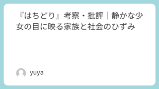 『はちどり』考察・批評|静かな少女の目に映る家族と社会のひずみ 韓国映画『はちどり』(原題:벌새、2018年)は、ある少女の視点から1990年代の韓国社会と、そこで生きる家族や個人の内面を繊細に描き出した作品です。目立った事件や派手な演出があるわけではないのに、多くの観客の心に深く刺さるこの映画は、一見... 2025.09.24 Uncategorized
