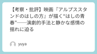 【考察・批評】映画『アルプススタンドのはしの方』が描く“はしの青春”──演劇的手法と静かな感情の揺れに迫る 甲子園のアルプススタンドの“はしの方”にいる、目立たない高校生たちの心の動きを丹念に描いた映画『アルプススタンドのはしの方』。もともとは高校演劇から始まった作品であり、その原点を生かしつつ、映画としての表現手法にも独特の工夫が凝らされていま... 2025.09.24 Uncategorized