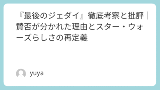 スター・ウォーズ・サーガ第8作目『最後のジェダイ』は、公開当初からファンや批評家の間で賛否が激しく分かれる異色の作品として語られています。シリーズの中心人物であったルーク・スカイウォーカーの変貌、血統主義の否定、フォースの新たな捉え方など、...