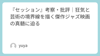 『セッション』考察・批評|狂気と芸術の境界線を描く傑作ジャズ映画の真髄に迫る 2014年に公開された映画『セッション(Whiplash)』は、若きジャズドラマーと鬼教師との緊張感あふれる関係を通して、芸術と狂気、教育と支配の境界線を鋭く描き出した衝撃作です。卓越した演出と演技、そして何より音楽が物語の核として強烈な印... 2025.09.21 Uncategorized