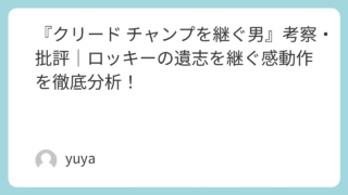 『クリード チャンプを継ぐ男』考察・批評|ロッキーの遺志を継ぐ感動作を徹底分析! 映画『クリード チャンプを継ぐ男』(原題:Creed)は、伝説的なロッキー・シリーズのスピンオフ作品として、2015年に公開されました。主演はマイケル・B・ジョーダン、監督はライアン・クーグラー。名作『ロッキー』の精神を継承しながらも、現代... 2025.09.21 Uncategorized