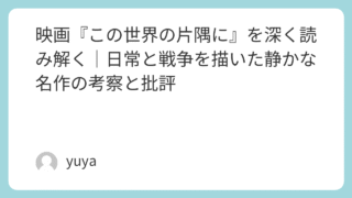 映画『この世界の片隅に』を深く読み解く|日常と戦争を描いた静かな名作の考察と批評 2016年に公開されたアニメ映画『この世界の片隅に』は、多くの観客の心に深い印象を残しました。原作はこうの史代による同名漫画で、片渕須直監督が丁寧に映像化した本作は、戦時下の広島・呉に生きる一人の女性「すず」の視点から、当時の暮らしや人々の... 2025.09.21 Uncategorized