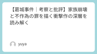 【葛城事件|考察と批評】家族崩壊と不作為の罪を描く衝撃作の深層を読み解く 近年の日本映画の中でも、観る者に強烈な後味と重苦しい余韻を残す作品として語り継がれているのが、赤堀雅秋監督による『葛城事件』です。この映画は、一つの家族が崩壊していく過程を描きながら、その裏にある人間関係の不和や社会との断絶、そして「罪」と... 2025.09.21 Uncategorized