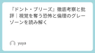 『ドント・ブリーズ』徹底考察と批評|視覚を奪う恐怖と倫理のグレーゾーンを読み解く 2016年に公開されたホラー/スリラー映画『ドント・ブリーズ』は、盲目の老人が住む家に押し入った若者たちが、逆に命を狙われるという斬新な設定で話題を呼びました。視覚障害を持つ「被害者」が、実は恐るべき能力を持つ加害者であるという構図は、観客... 2025.09.21 Uncategorized