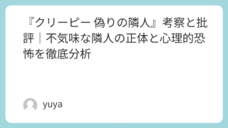 『クリーピー 偽りの隣人』考察と批評|不気味な隣人の正体と心理的恐怖を徹底分析 黒沢清監督による2016年公開の映画『クリーピー 偽りの隣人』は、サイコサスペンスというジャンルの中でも、極めてリアルな不気味さと人間心理の歪みを描いた作品です。事件の真相を追う元刑事と、隣に住む得体の知れない男、西野。静かな日常の中に忍び... 2025.09.21 Uncategorized