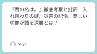 『君の名は。』徹底考察と批評|入れ替わりの謎、災害の記憶、美しい映像が語る深層とは? 2016年に公開され、日本国内外で大ヒットを記録した新海誠監督のアニメ映画『君の名は。』。青春・恋愛・SFを融合させた本作は、美しい映像表現やRADWIMPSによる音楽、そして複雑に絡み合う物語構造により、多くの観客に衝撃と感動を与えました... 2025.09.21 Uncategorized