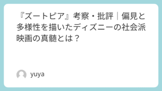 『ズートピア』考察・批評|偏見と多様性を描いたディズニーの社会派映画の真髄とは? ディズニー映画『ズートピア』は、一見すると可愛らしい動物たちが活躍するファンタジー作品に見えます。しかしその背後には、現代社会が抱える「差別」「偏見」「多様性」といった重厚なテーマが巧みに織り込まれており、子供だけでなく大人にこそ響くメッセ... 2025.09.21 Uncategorized